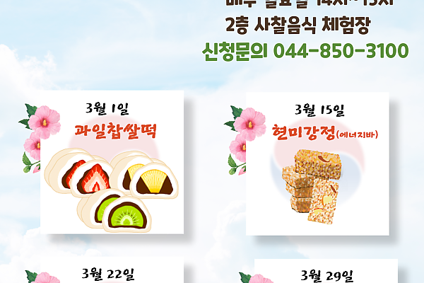 간식만들기 체험 안내입니다 · 체험일시 : 매주 일요일 오후 2:00 ~ 3:00 · 인원 : 선착순 24명 · 준비물 : 개인행주, 음식담아갈…