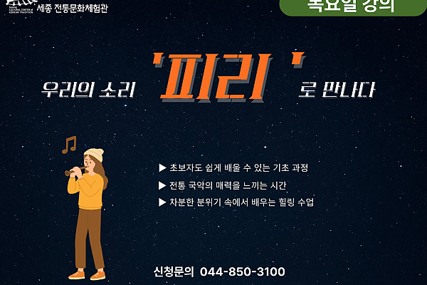 · 강의일시 : 매주 목요일 14:00 ~ 16:00· 인원 : 15명·준비물 : 개인 악기감사합니다.☏문의)044-850-3100▶ 모든 프로…