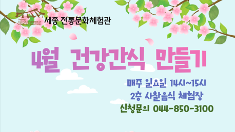 간식만들기체험 안내입니다· 체험일시 : 매주 일요일 오후 2:00 ~ 3:00· 인원 : 선착순 24명· 준비물 : 개인행주, 음식담아갈 용기 …