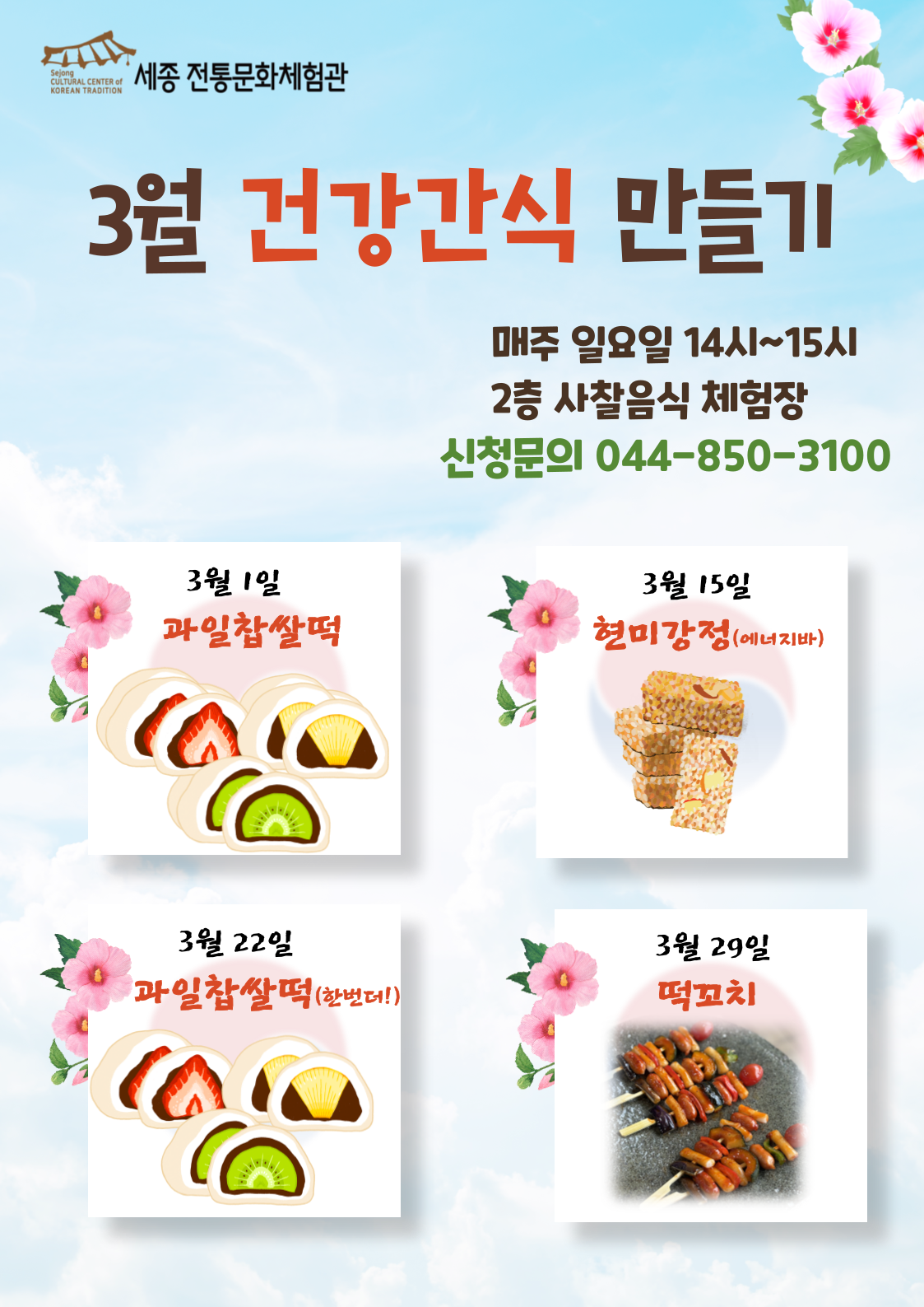 일요일 간식은 체험관에서 최고관리자 2023-02-28 최고관리자 0 3106 2023.02.28 14:57 간식만들기 체험 안내입니다 · 체험일시 : 매주 일요일 오후 2:00 ~ 3:00 · 인원 : 선착순 24명 · 준비물 : 개인행주, 음식담아갈 용기 1개 · 본 체험은 선착순 신청입니다. 매주 목요일 전까지 유선 예약 바랍니다. · 체험인원이 10명 미만이면, 체험이 진행되지 않습니다. · 재료 사전 준비로 인하여 환불이 되지 않으니 유의하여 주시기 바랍니다. 신청 및 문의) 044-850-3100