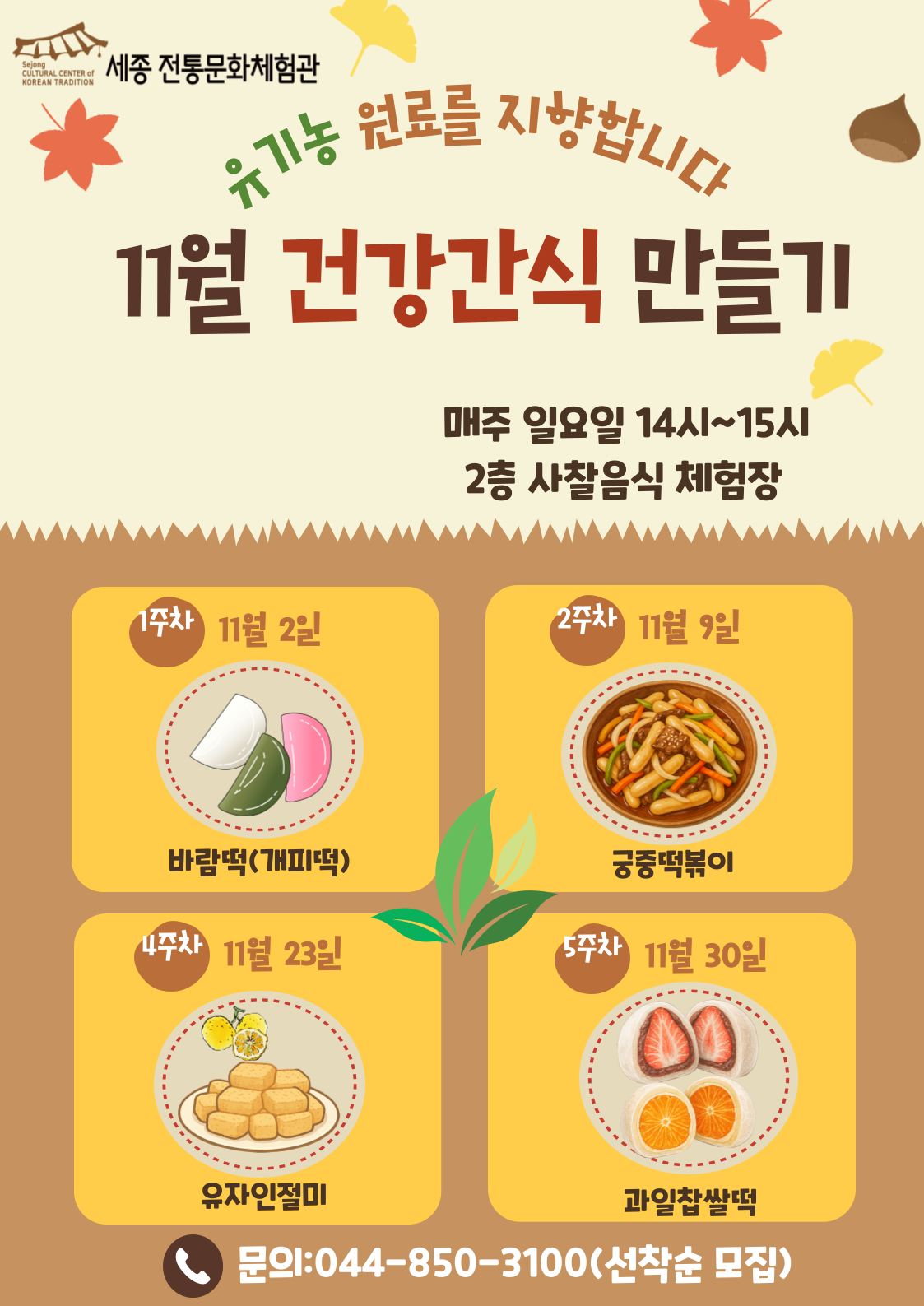 일요일 간식은 체험관에서 최고관리자 2023-02-28 최고관리자 0 2686 2023.02.28 14:57 간식만들기 체험 안내입니다 · 체험일시 : 매주 일요일 오후 2:00 ~ 3:00 · 인원 : 선착순 24명 · 준비물 : 개인행주, 음식담아갈 용기 1개 · 본 체험은 선착순 신청입니다. 매주 목요일 전까지 유선 예약 바랍니다. · 체험인원이 10명 미만이면, 체험이 진행되지 않습니다. · 재료 사전 준비로 인하여 환불이 되지 않으니 유의하여 주시기 바랍니다. 신청 및 문의) 044-850-3100