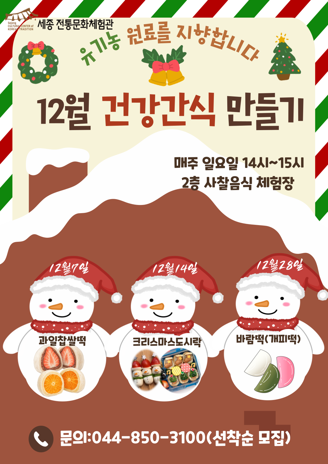 일요일 간식은 체험관에서 최고관리자 2023-02-28 최고관리자 0 2813 2023.02.28 14:57 간식만들기 체험 안내입니다 · 체험일시 : 매주 일요일 오후 2:00 ~ 3:00 · 인원 : 선착순 24명 · 준비물 : 개인행주, 음식담아갈 용기 1개 · 본 체험은 선착순 신청입니다. 매주 목요일 전까지 유선 예약 바랍니다. · 체험인원이 10명 미만이면, 체험이 진행되지 않습니다. · 재료 사전 준비로 인하여 환불이 되지 않으니 유의하여 주시기 바랍니다. 신청 및 문의) 044-850-3100