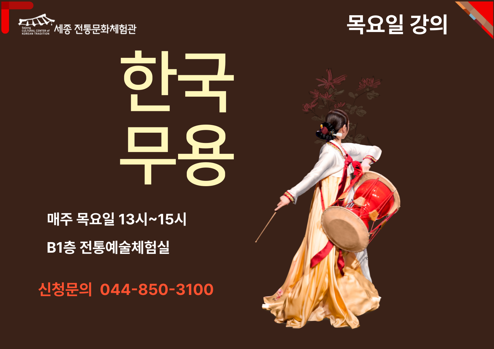 한국무용 최고관리자 2026-03-17 최고관리자 0 30 03.17 15:46 · 강의일시 : 매주 목요일 오전 13:00 ~ 15:00 · 인원 : 15명 감사합니다.☏문의) 044-850-3100▶ 모든 프로그램은 2개월 단위로 접수·진행됩니다. ▶ 취소는 프로그램 개강 3일전까지 가능합니다. (3일전 취소시 전액환불) ▶ 부분취소, 부분접수는 불가합니다. ▶ 선착순 마감으로 진행합니다▶ 예약 전 반드시 주의사항을 숙지해주세요• 체험 – 사전접수(수업가능 인원 부족 시 폐강, 체험비 전액 환불)• 신청 전 재료비가 있는 프로그램인지 유선상으로 꼭 확인하시길 바랍니다.